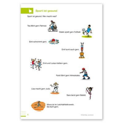 Die sechs Postermotive aus dem Ordner finden sich auch am Anfang eines jeden Themenkapitels im Hör-Lese-Buch wieder und bieten eine Fülle an Wortschatz und Strukturen. Die Kinder haben auf jeder Doppelseite die Möglichkeit, das sprachlich Gelernte aktiv anzuwenden, indem sie sich mit dem Mikro des BOOKii Hörstifts aufnehmen und kleine Arbeitsaufträge ausführen: Fragen beantworten, von sich erzählen, Mitschüler*innen interviewen.