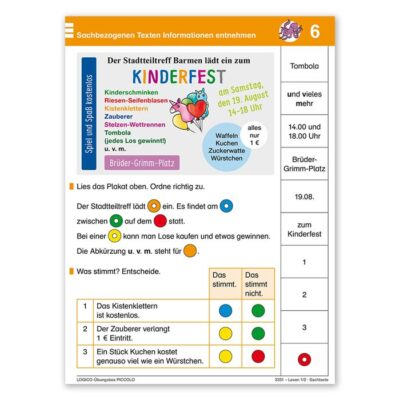 Die LOGICO-Übungsbox Lesen 1/2 greift von Anfang an anregende und altersgemäße Themen auf, die bei den Kindern Neugier wecken und sie zum Lesen motivieren. Anhand eines breiten Spektrums an Textsorten mit hohem Aufforderungscharakter wird Lesefertigkeit Schritt für Schritt aufgebaut. Zahlreiche Illustrationen und eine durchdachte Strukturierung der Lesetexte unterstützen das Textverständnis.