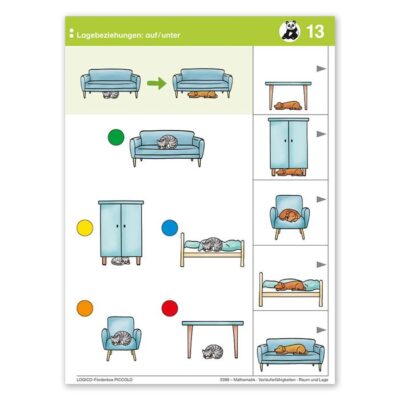 Ohne schriftliche Anweisungen und mit starker bildlicher Unterstützung führt die Box in einem Einführungskapitel zunächst an das Arbeiten mit LOGICO heran. So ist es möglich, dass die Kinder eigenständig mit dem Material arbeiten können. Kleinschrittig führt die Box anschließend kapitelweise durch folgende Kompetenzbereiche: